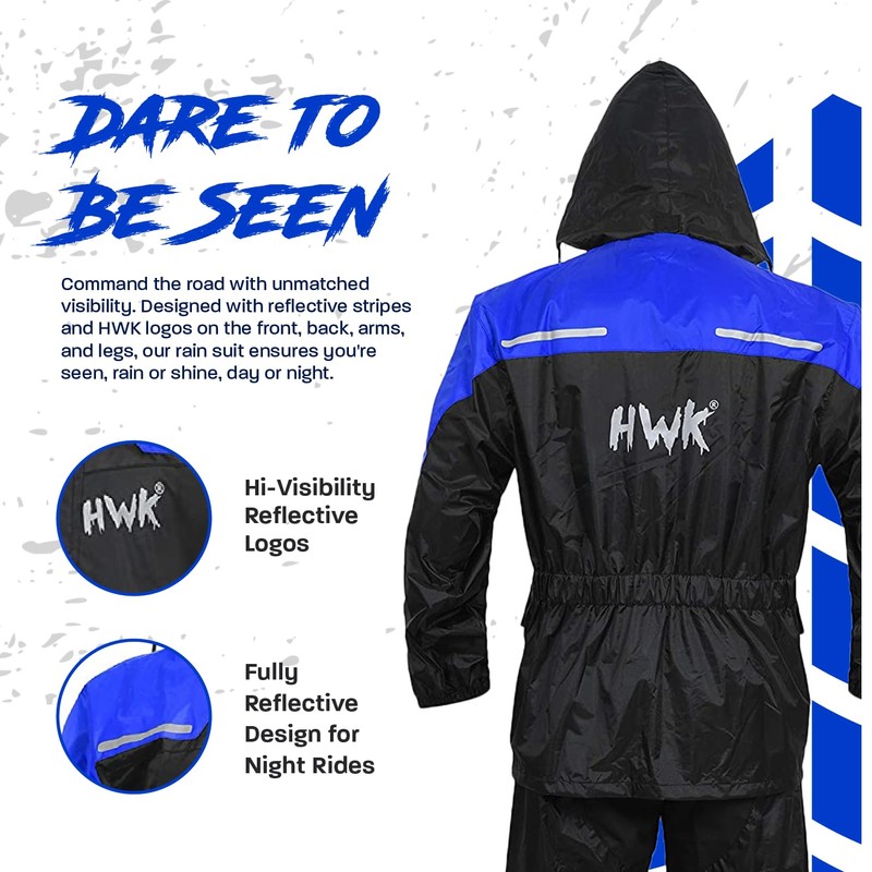 - Hi Vis Riding. The motorcycle rain suit comes with reflective stripes and HWK logos on the front, back, arms, and legs, keeping you highly visible in low light and bad weather conditions