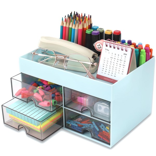 HWPRATO Mini Drawer Organizers Accessories with Compartments and Drawers, Plastic Pen Holder for Desktop Storage for School, Office Supplies (4 Drawer Desk Organizer-Blue)