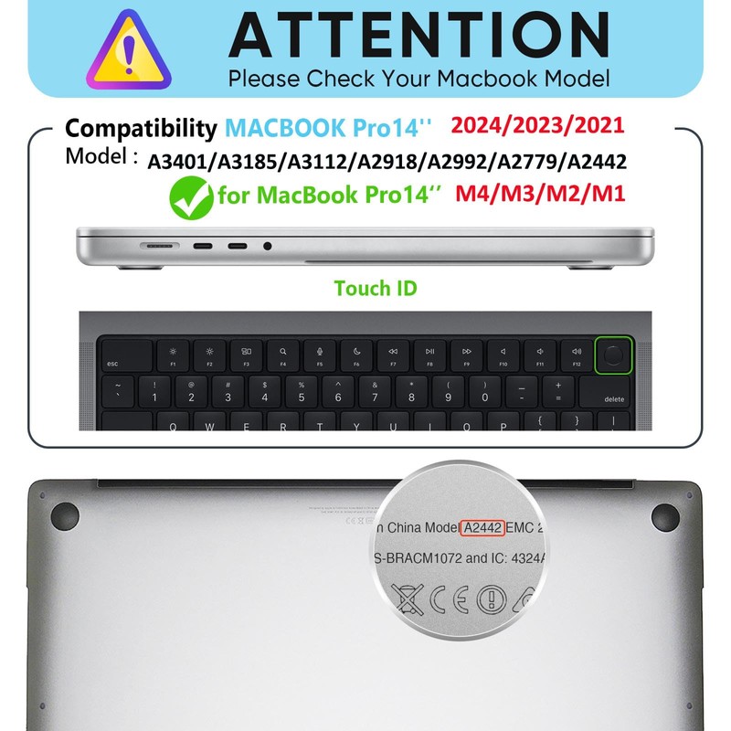 - Check Model Number : ONLY compatible with MacBook Pro 14 inch Cover M4/M3/M2/M1 (A3401 / A3185 / A3112 / A2918 / A2992 / A2779 / A2442) 2024/2023/2021 released, not for other models, and you can find step by step install instruction video in our store.