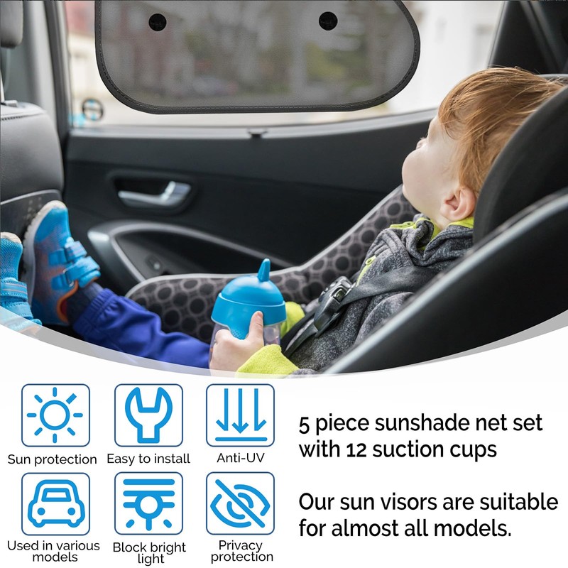 - Was Sie Erhalten5 x Sonnenschutz Auto, 12 x Saugn?pfe (starken Halt). Schtzen Sie Ihre Kinder vor sch?dlicher Sonnenstrahlung. Unser Sonnenschutz bietet erstklassigen UV-Schutz, ideal fr Autofahrten an sonnigen Tagen.