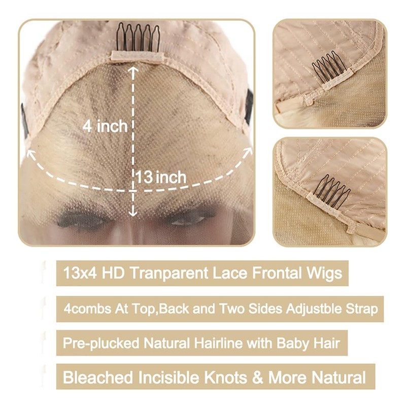 - Real hair wig: 13 x 4 lace front wig. High end lace is realistic and breathable. There are four combs and two adjustable straps inside the hat. Meet the needs of most head circumference.