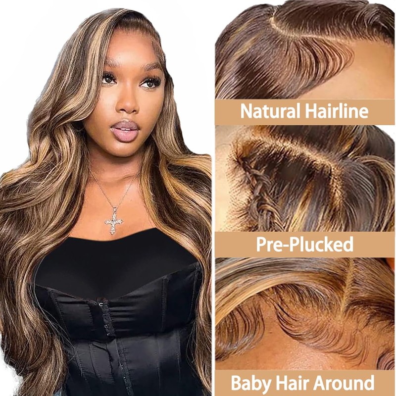 Hxxcoup Women's Real Hair Wig, 4 x 1 Lace Human Hair Wig, P4/27 Highlight Blonde Body Wave, Pre-Plucked Hairline with Baby Hair, Unprocessed Hair, Transparent Lace for Women, Minimal Smell, 28 Inches