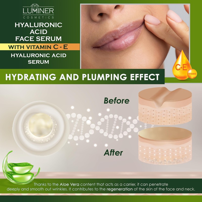 Hyaluronic Acid Face Serum 100 ml, Vitamin C Serum, Natural Anti-Wrinkle Formula with Snail Slime, Aloe Vera, Vitamin C-E, Moisturising Plumping Eye Contour, Made in Italy LUMINER