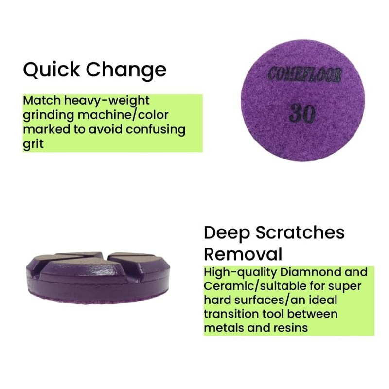 - Match: ComeFloor 0.4" thickness 3" diameter ceramic diamond polishing pucks suit Sase/Diamatic/Lavina/WolfPack/Xingyi/Terrco/Edco/HTC/STI/Fast Change/Relon/Rhino/Werkmaster/Scanmaskin grinder