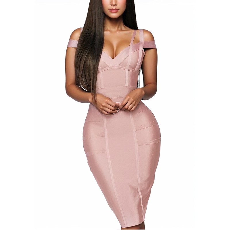 Hybrid & Company Womens Elegance V-Neck Knee-Length Stretch Chic Pink Midi Bandage Dress DRBD132 BLUSH S