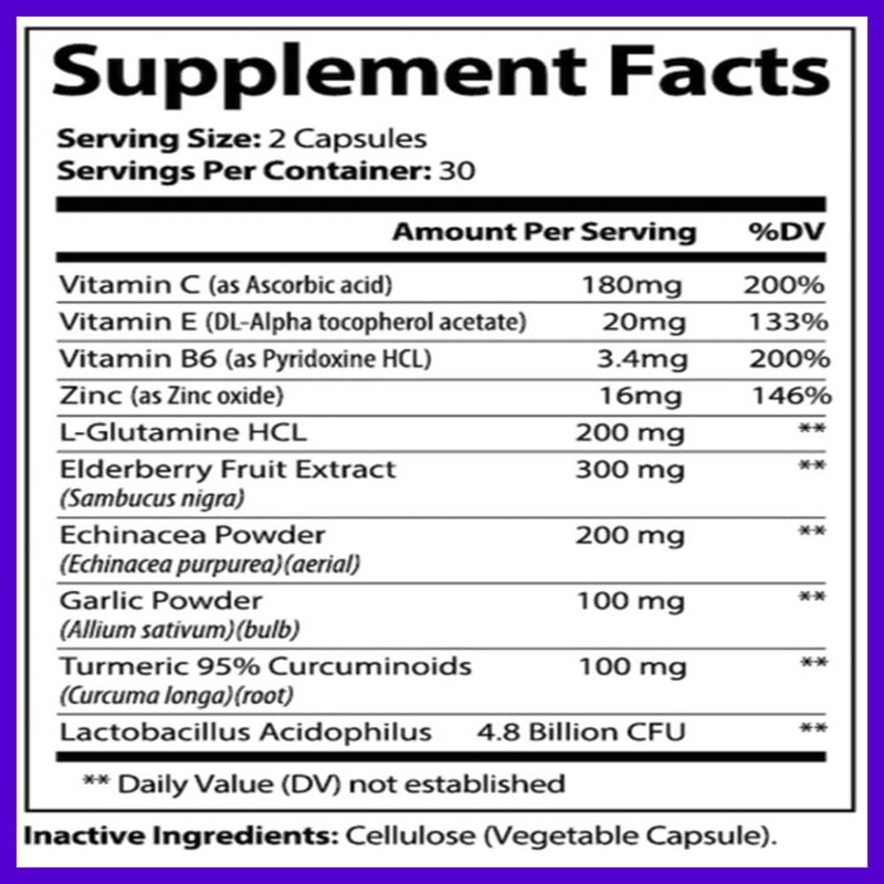 - POWERFUL FORMULA - Formulated to suppport your immune system with 200% daily value of Vitamin C, 146% DV of Zinc, 133% DV of Vitamin E, and 200 mg Echinacea, 100 mg Garlic Powder, 100 mg Turmeric, 200 mg L-Glutamine, 4.8 BCFU of Lactobacillus as well as 300mg of Sambucus black elderberry extract.