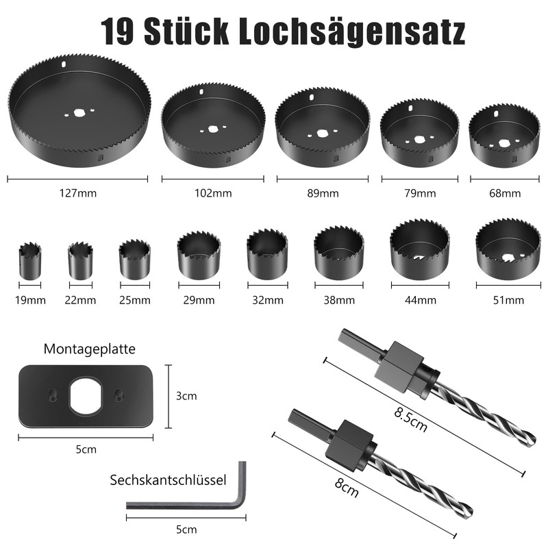 - Erfllen Sie den T?glichen Bohrbedarf: "Die HYCHIKA Lochs?ge Set enth?lt 13 tlg Lochs?ge, um Ihren Anforderungen gerecht zu werden, ? 19-127 mm (19, 22, 25, 29, 32, 38, 44, 51, 68, 79, 89, 102, 127). Sie k?nnen problemlos zwischen Lochs?ge mit unterschiedlichen Durchmessern wechseln, da sie vom Dorn getrennt sind