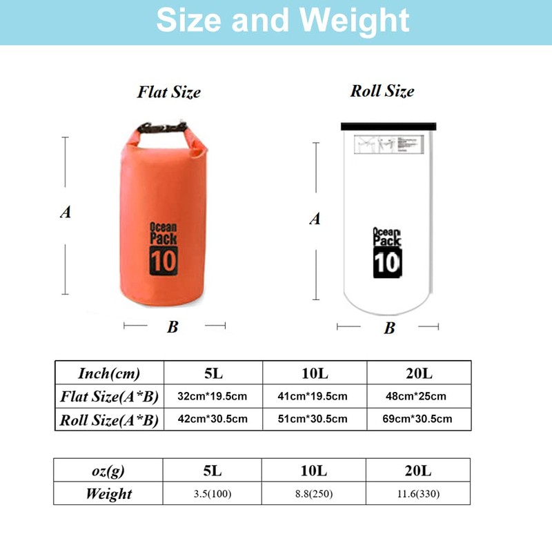 - ADJUSTABLE STRAP – Our waterproof dry bag comes with 2 styles adjustable and removable shoulder strap, Cross-body carrying for 5L/10L and Double shoulder carrying for 20L.