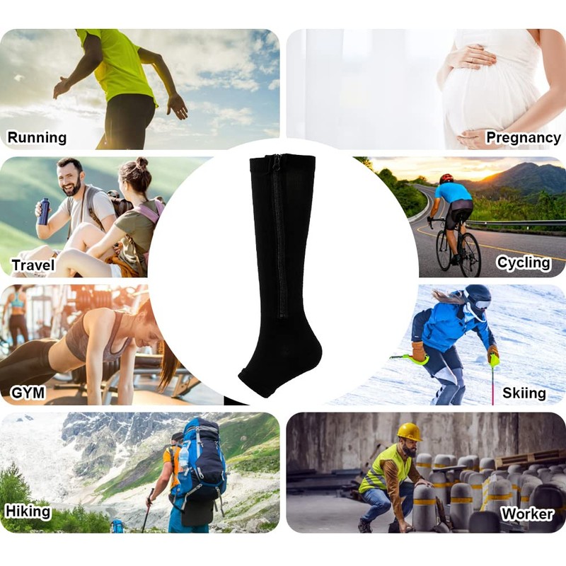 - ZIPPER AND OPEN TOE: Zipper compression socks are easier to wear and take off than ordinary compression socks, and high-quality zippers are smooth and easy to pull up. The open toe design can prevent pressing the toes and causing pain.