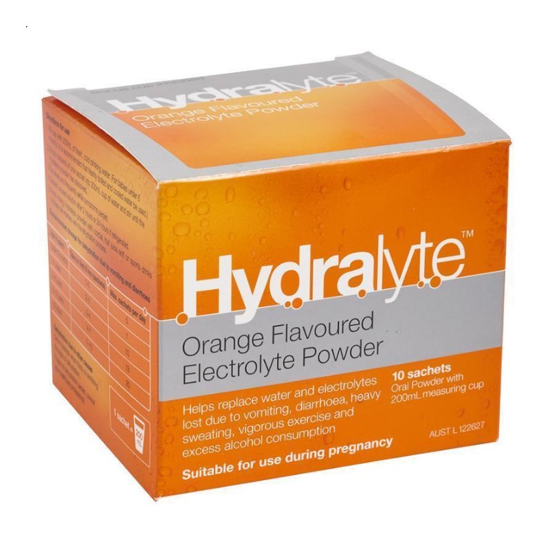 Hydralyte Electrolyte Powder Orange relieves symptoms of dehydration and helps replace water and electrolytes lost due to vomiting, diarrhoea, heavy sweating, vigorous exercise and occasional hangovers.