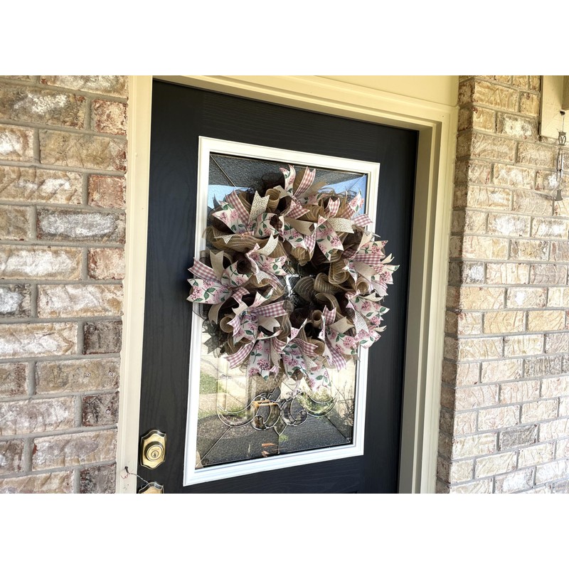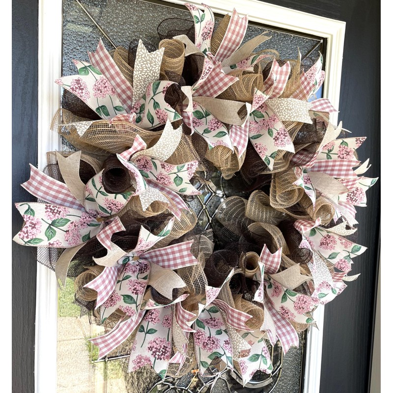 Hydrangea Floral Dusty Rose Plaid Summer Fall Spring Deco Mesh Wreath, Front Door Wall Entryway, Patio Porch Garden, Living Room Bedroom Wall Decoration, Handmade Handcrafted