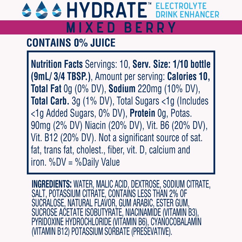 hydrate Electrolyte Liquid Drink Enhancer Drops, Low Sugar, Low Calorie, Natural Flavor Hydration Mix with Essential Vitamins B3 B6 B12 (6.22 Fl Oz (Pack of2), Mixed Berry)