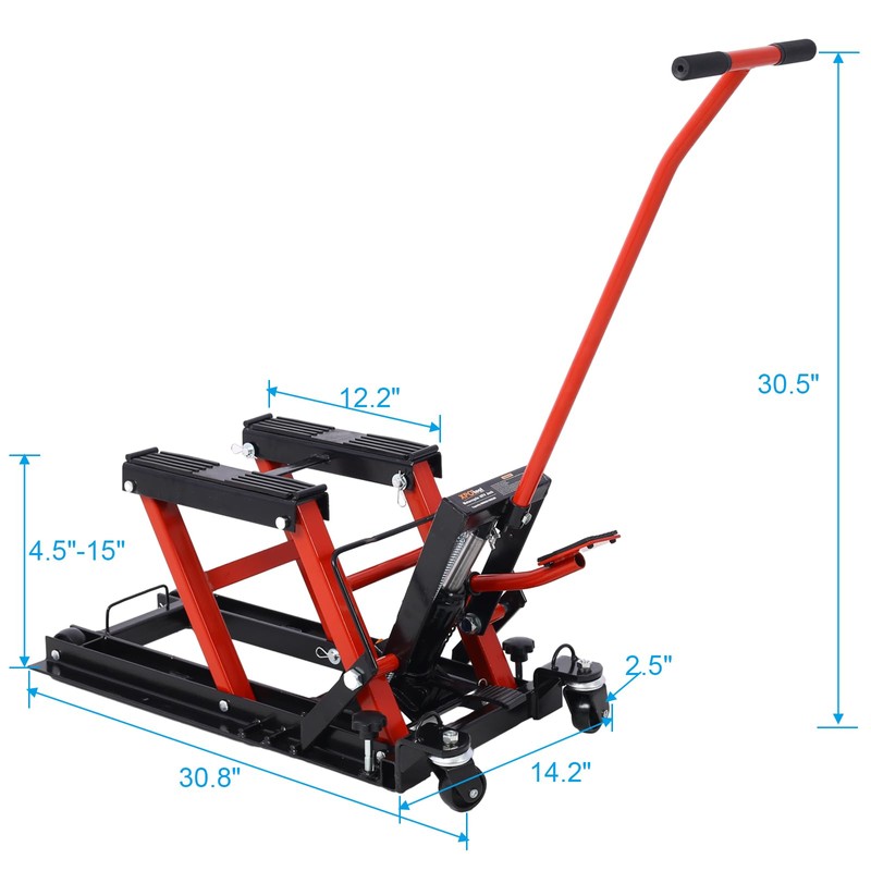 - Hydraulic Motorcycle Lift Jack: this motorcycle lift jack with a long handle and press pedal, allows easy operation and lifting with minimal effort. The high-quality hydraulic pump provides a lifting range of 4.7 to 15 inches, making motorcycle jack stand lift perfect for heavy motorcycles with less resistance.