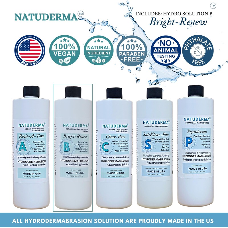 - Proudly MADE IN THE USA - PARABEN FREE. Natuderma Bright-Renew Hydro dermabrasion solution & the Super Vitamin C Serum are made in the USA with natural ingredients, paraben free, phthalate free, vegan, no animal testing.