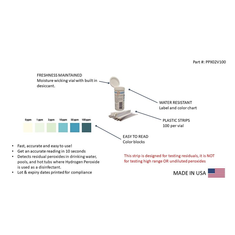 Hydrogen Peroxide H2O2 Test Strips, Low Level, 0-100 ppm [Vial of 100 Strips]
