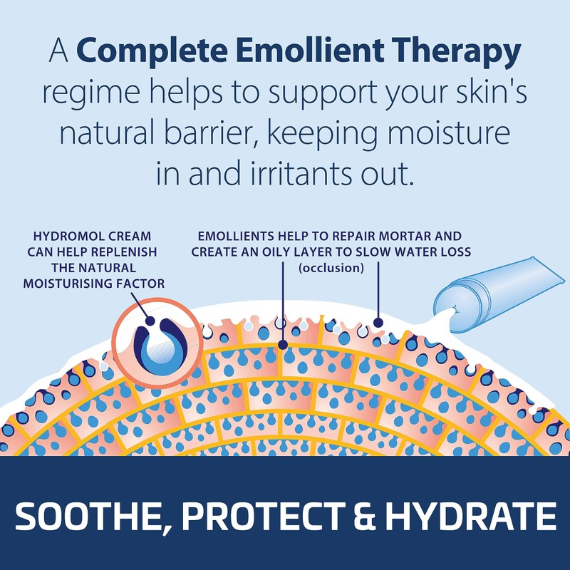 - Forms a protective skin barrier: Hydromol ointment helps to soothe, moisturise and protect the skin by forming a protective barrier on the surface of the skin to seal in moisture and prevent water loss.