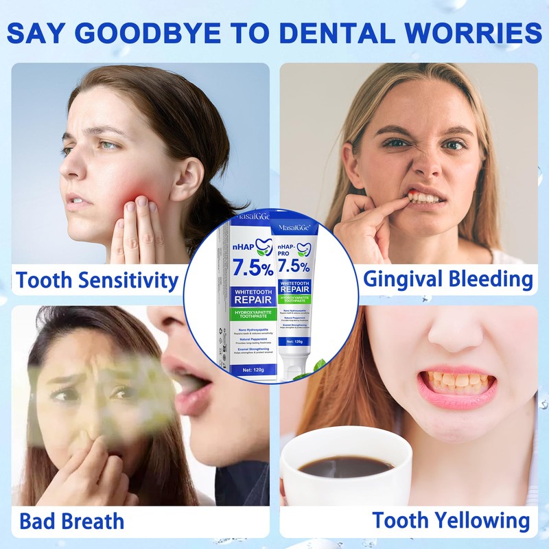 - 7.5% Hydroxyapatite Toothpaste: This toothpaste is designed to repair and protect tooth enamel, reducing the risk of cavities and erosion,Powered by hydroxyapatite, a naturally occurring mineral that helps effectively restore and strengthen tooth enamel, protecting your teeth from daily wear and tear.