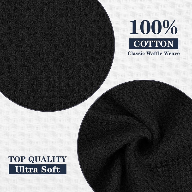 HYER KITCHEN 100% Cotton Waffle Weave Kitchen Dish Towels, Super Soft Absorbent Quick Drying Cleaning Towel, 12x12 Inches, 6-Pack, Black