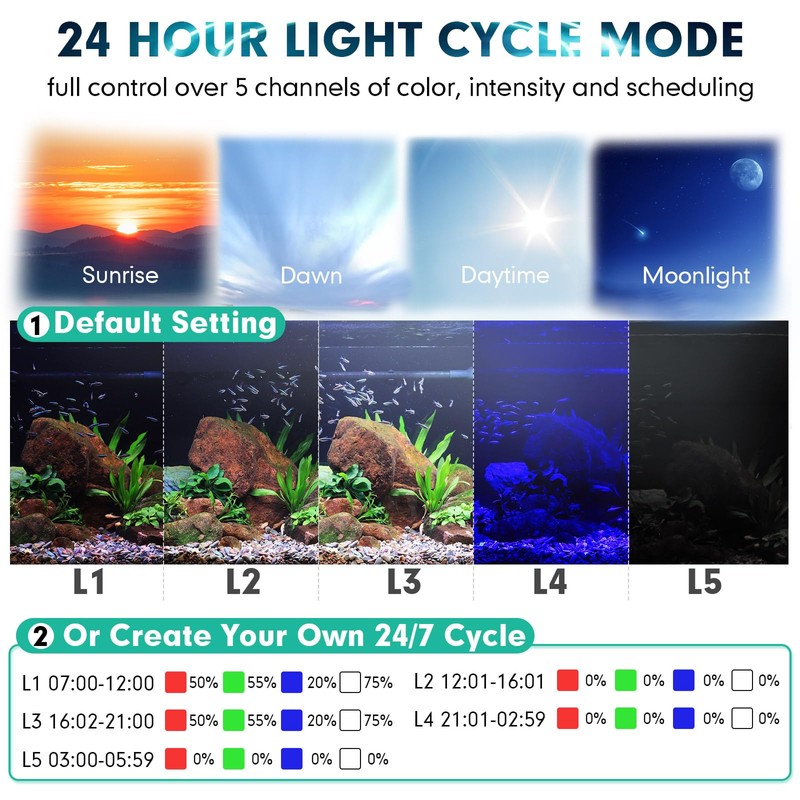 - Create Your Own 24/7 Mode -- The preset 24/7 lighting cycle starts with a cool lit dawn, slowly brightens into intense high noon and finishes with an starry blue moonlight. Besides, you can modify or create your own 24/7 cycle by configuring a color spectrum over 5 channels and scheduling when to turn on and off. Each of the five channels can be dimmed from 0%-100%, which allows you to set more custom lighting choice, such as running a siesta