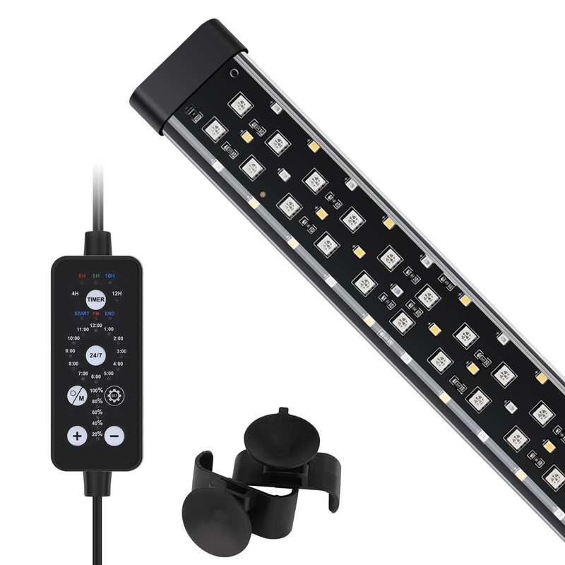 - DIY Mode: The aquarium light has 5 timers (4H, 6H, 8H, 10H, or 12H), 9 customizable lighting colors (full-spectrum white, red, green, blue, pink, purple, cyan, orange and gradient) and 10 adjustable brightness levels. By using different effects and colors you can create a spectacular atmosphere that really showcases the fish and creates a beautiful addition to any room