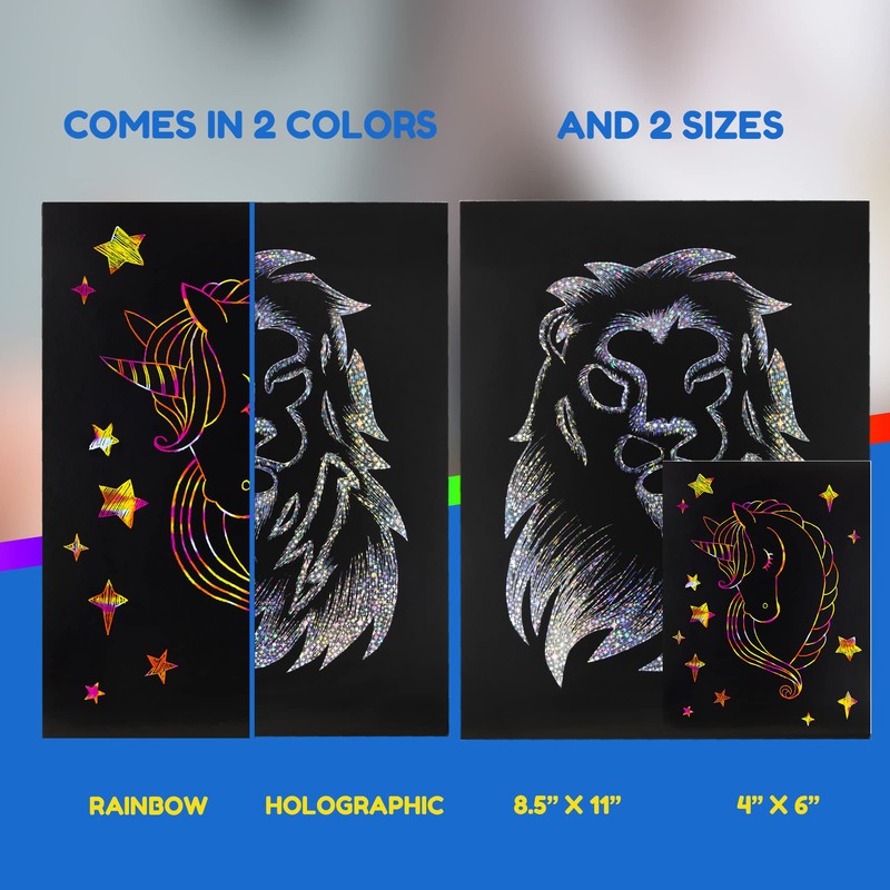 • DURABLE & HIGH-QUALITY SCRATCH OFF PAPER - These scratch silver holographic art sheets are long-lasting and high quality and measure 4”x6”. Each scratch paper is safe to use, non-toxic and fast to clean up. Easily dry wipe the black residue resulting from scratching and the arts and crafts are good to go!
