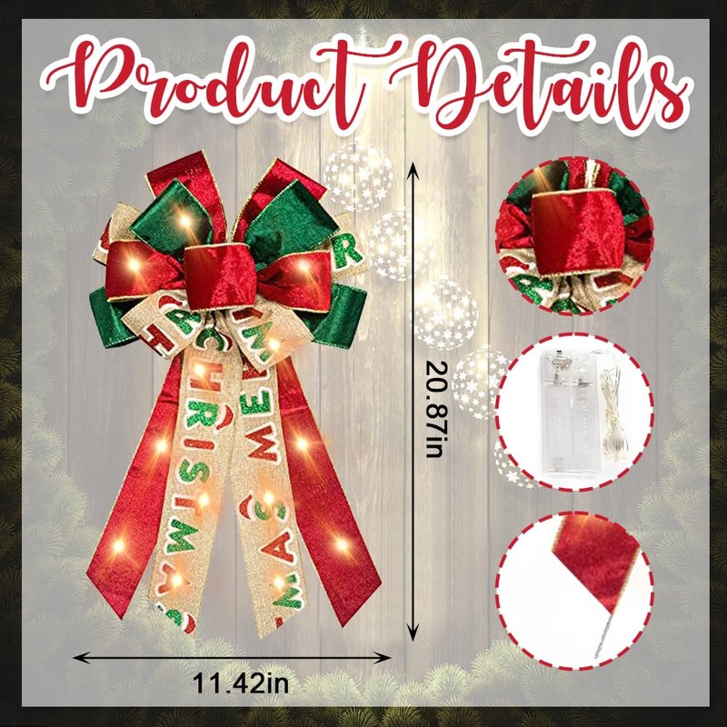 - Design: The LED Christmas bows are composed of three ribbons, one is a Merry Christmas letters pattern natural burlap ribbon, one is a red velvet ribbon, the other is a green velvet ribbon bow. These exquisite Christmas decorations bows are enough for your daily use and add special festival feelings.