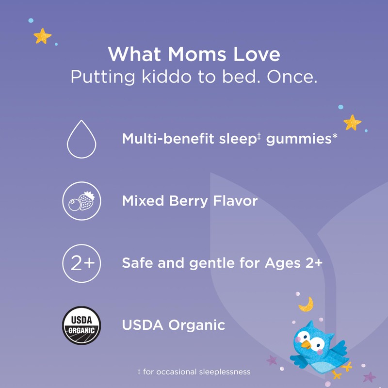 Organic support for sleep and wellness, all in one bite. A kid's body needs plenty of sleep to grow, and be well. But a kid's busy brain doesn't always wind down at bedtime. With these gentle gummies as part of the bedtime ritual, it's easy to settle into that cozy blanket of relaxation and immune-enhancing protection, so your energetic kid can zoom off to zzzz-land. Lemon Balm - herb from the mint family known to support restful sleep. Chamomile - daisy like plant commonly used to support relaxation. Black Elderberry - Sambucus nigra, the botanical known for generations to support healthy immune function. Free of milk, peanuts, tree nuts, wheat, gluten, fish, shellfish, egg, sesame, gelatin, high fructose corn syrup, salicylates, synthetic dyes, artificial flavors, and artificial sweeteners.