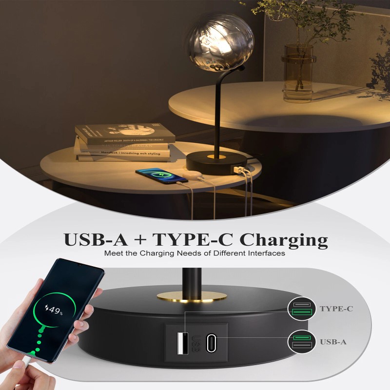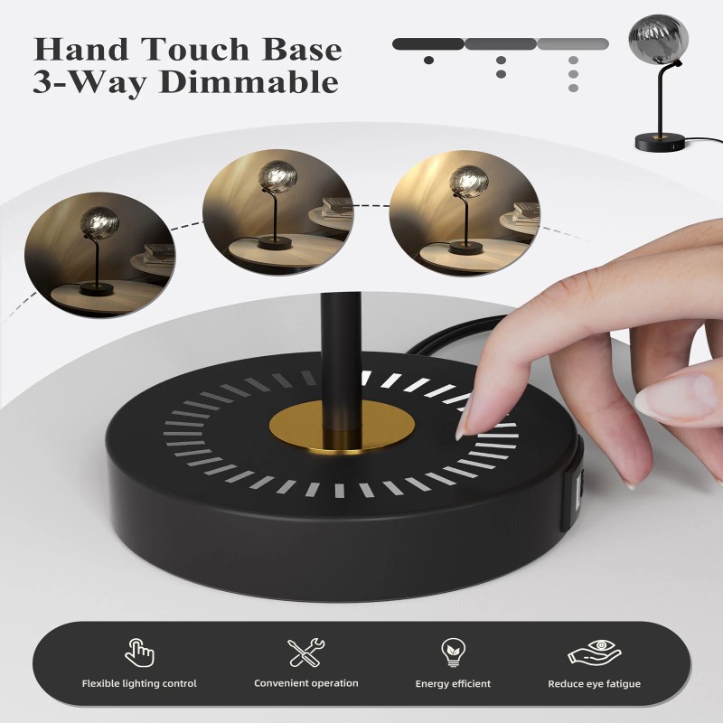 HYMELA Glass Table Lamp 3-Way Dimmable Bedroom Globe Desk Light USB A+C Charging Port