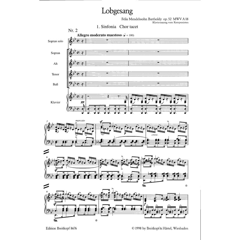 Hymn of Praise (MWV A 18), op.52 - Symphony Cantata (Symphony No.2) - Breitkopf Urtext - Soloists, 2 mixed choirs and orchestra - vocal/piano score - German/English - (EB 8676)