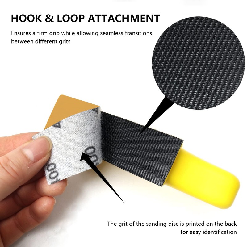 - Hook & Loop Attachment – The sanding block features a secure hook & loop system for quick and easy sandpaper changes, ensuring a firm grip while allowing seamless transitions between different grits.