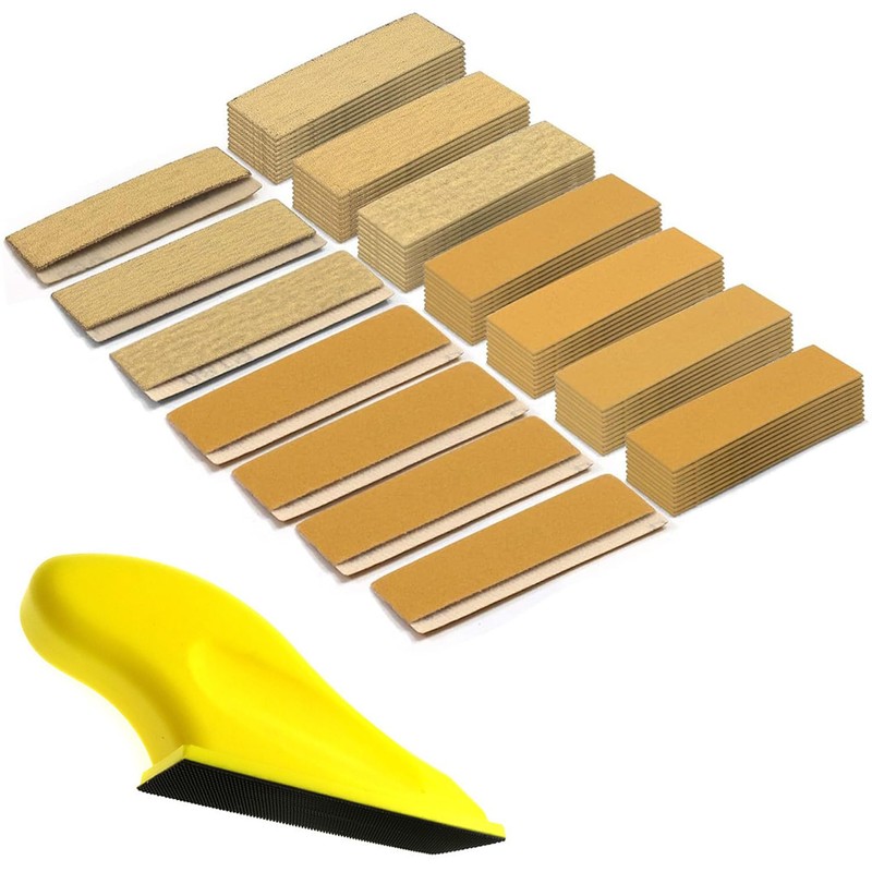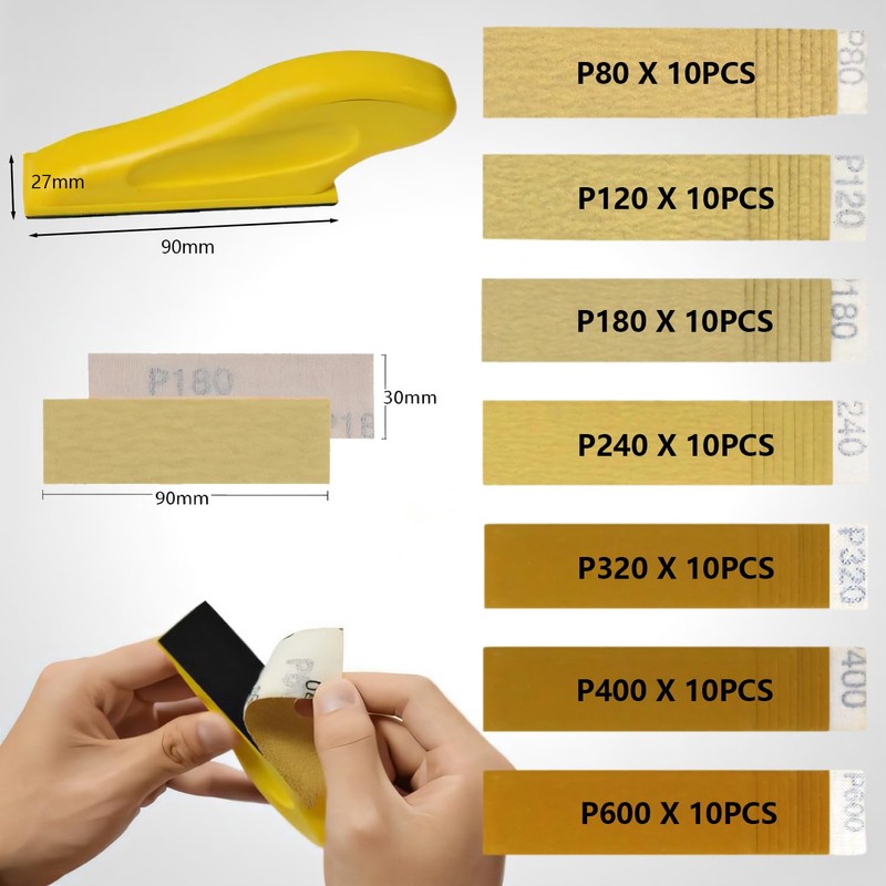 - Complete Detail Sanding Kit – Includes 70 sheets of high-quality alumina sandpaper (80 to 600 grit) and a 3.5” x 1.1” ergonomic hand sanding block, perfect for small projects, tight spaces, and intricate detailing.