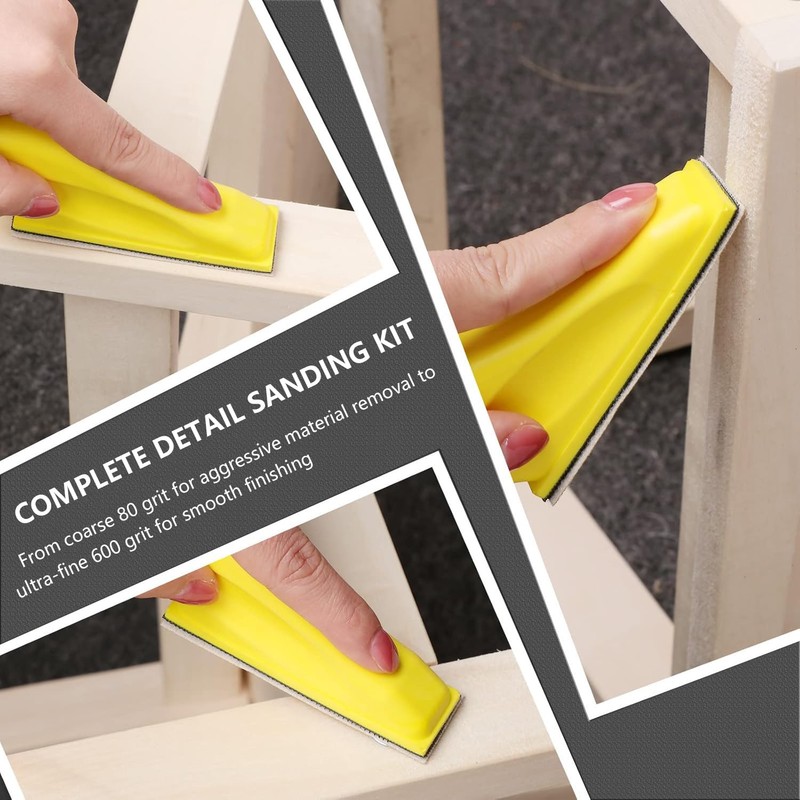 - Complete Detail Sanding Kit – Includes 70 sheets of high-quality alumina sandpaper (80 to 600 grit) and a 3.5” x 1.1” ergonomic hand sanding block, perfect for small projects, tight spaces, and intricate detailing.