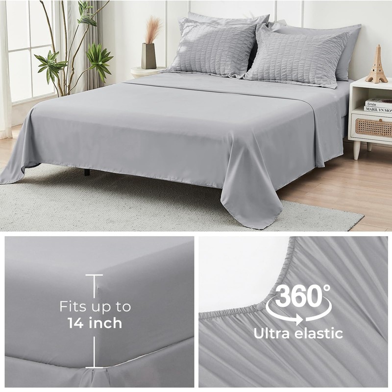 - Deep Pocket Fitted Sheet: Our stretchy deep-pocket fitted sheet easily fits any 12-15 inch mattress and stays in place no matter how you toss and turn; the soft brushed microfiber fabric provides just the right amount of warmth and comfort