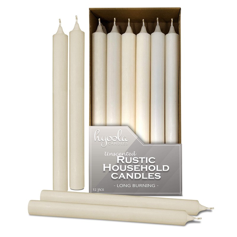 - SIZE: 10 inch height x 0.85 inch diameter (25cm x 2.2cm). PACK: 12-pack. COLOR: Wool White. BURN TIME: 10 hours. CANDLE: Dripless and unscented. WICK: Smokeless, 100% cotton and lead-free wicks.