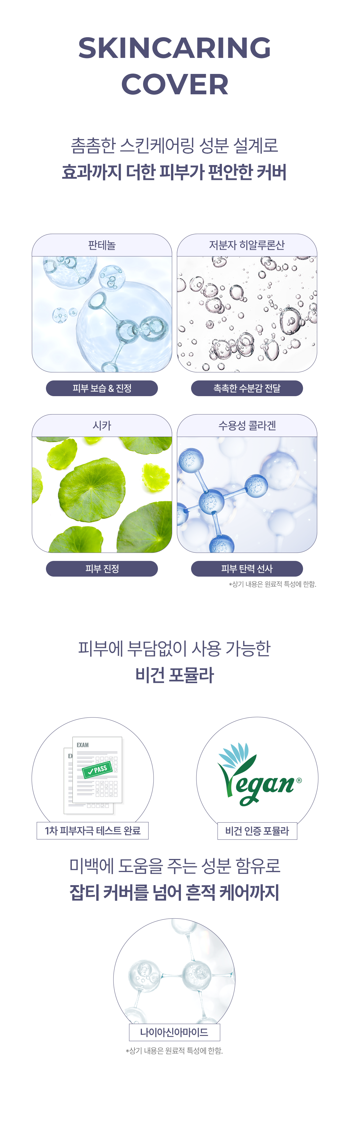 02 베이지 : 정제수, 티타늄디옥사이드, 사이클로펜타실록세인, 다이페닐실록시페닐트라이메티콘, 부틸렌글라이콜, 메틸트라이메티콘, 부틸옥틸살리실레이트, 카프릴릴메티콘, 라우릴피이지-10트리스(트라이메틸실록시)실릴에틸다이메티콘, 나이아신아마이드, 카프릴릭/카프릭트라이글리세라이드, 변성알코올, 트라이메틸실록시실리케이트, 다이메티콘, 글리세린, 다이스테아다이모늄헥토라이트, 소듐클로라이드, 라우릴피이지-9폴리다이메틸실록시에틸다이메티콘, 트라이실록세인, 아크릴레이트/스테아릴아크릴레이트/다이메티콘메타크릴레이트코폴리머, 폴리메틸실세스퀴옥세인, 합성플루오르플로고파이트, 프로판다이올, 다이메티콘/피이지-10/15크로스폴리머, 트라이에톡시카프릴릴실레인, 알루미늄하이드록사이드, 카프릴릴글라이콜, 아이소도데케인, 칼슘알루미늄보로실리케이트, 글리세릴카프릴레이트, 에틸헥실글리세린, 아데노신, 다이소듐이디티에이, 호호바씨오일,다이프로필렌글라이콜, 틴옥사이드, 하이드록시프로필비스팔미타마이드엠이에이, 소듐시트레이트, 스쿠알란, 판테놀, 토코페롤, 1,2-헥산다이올, 풀루란, 프룩토올리고사카라이드, 귀리단백질추출물, 티트리잎추출물, 하이드롤라이즈드소듐하이알루로네이트, 마데카소사이드, 아시아티코사이드, 엘더꽃추출물, 오렌지꽃추출물, 자목련꽃추출물, 참나리추출물, 푸르메리아 루브라꽃추출물,베타-글루칸, 말토덱스트린, 하이드롤라이즈드익스텐신, 마데카식애씨드, 매스틱검, 아시아틱애씨드, 향료, [+/-] 티타늄디옥사이드 (CI 77891), 적색산화철, 황색산화철, 흑색산화철