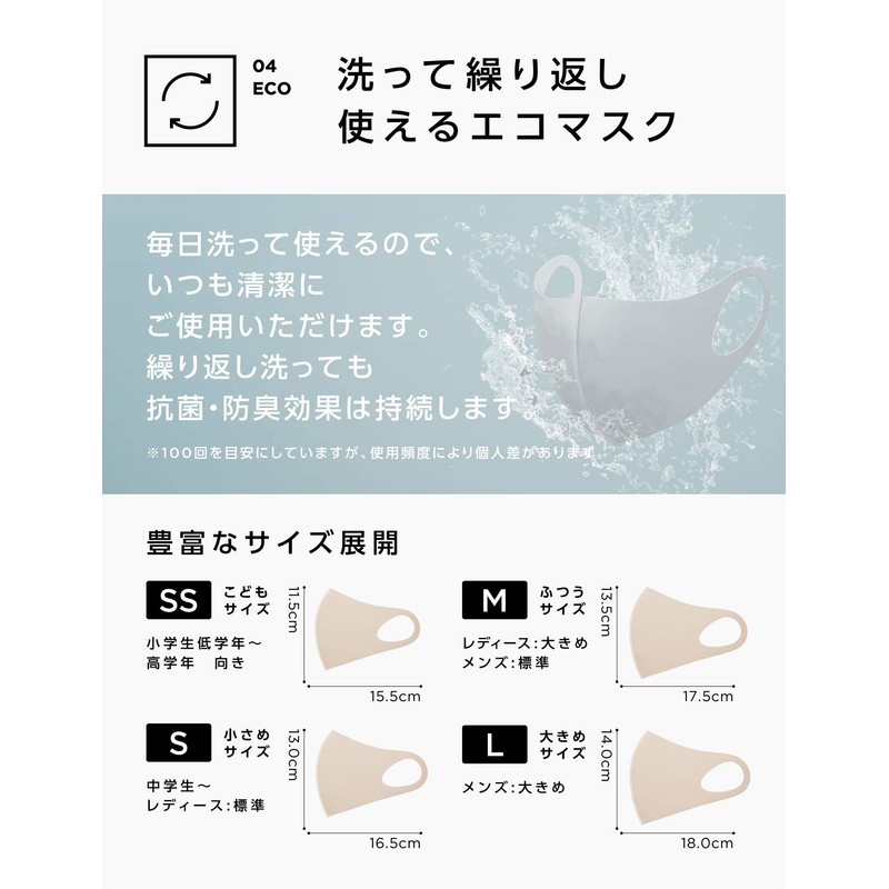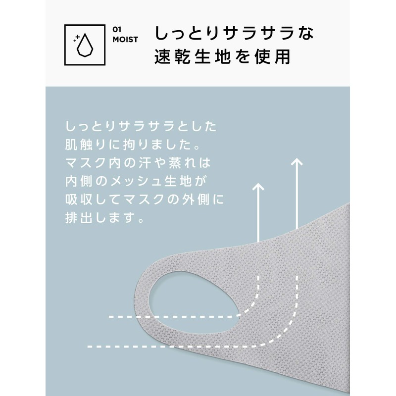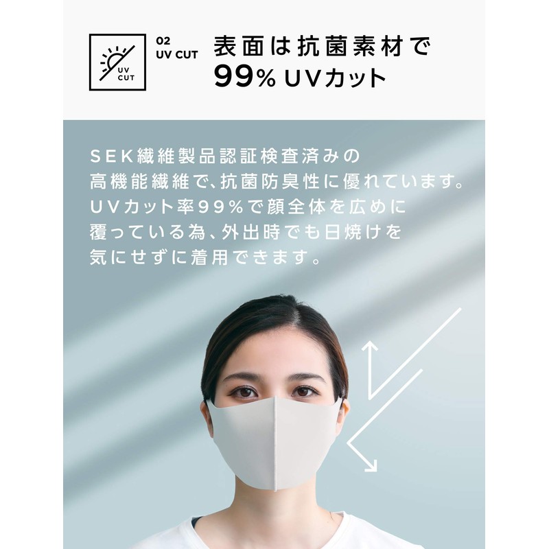- [機能] しっとり抗菌 / 抗菌・防臭 / 吸汗速乾 / UV99%カット / 安心の日本製 / 繰り返し使える /3D FIT 構造 / 優れた伸縮性
