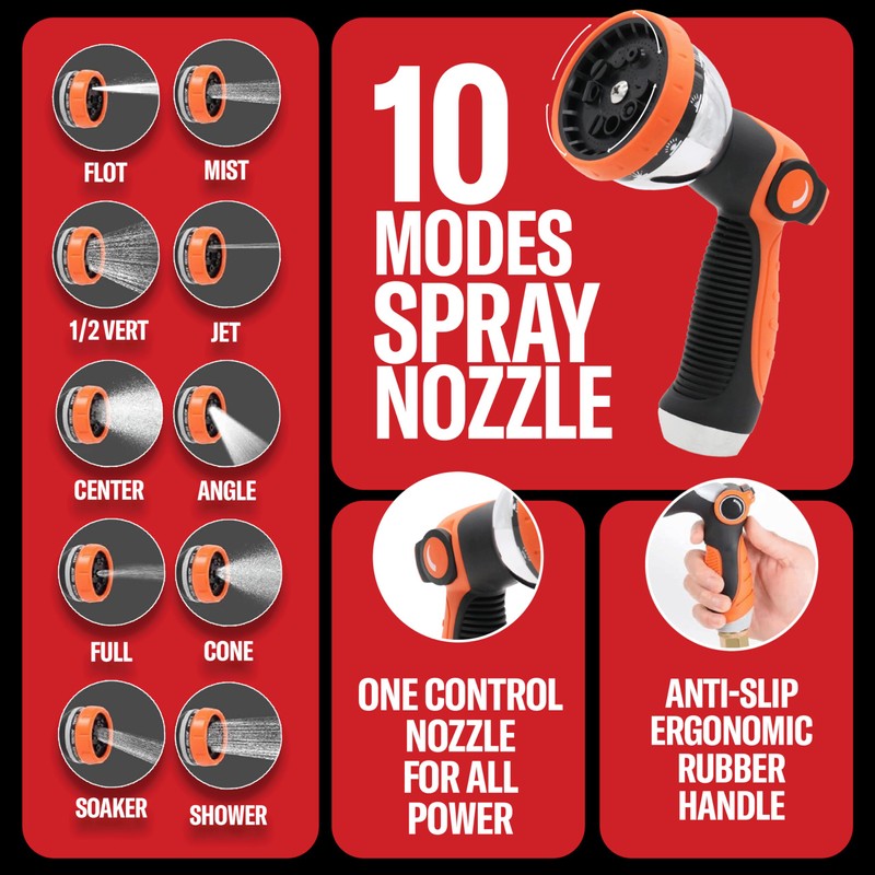 - THE ULTIMATE FULL DURABLE SET: Engineered with precision using the best materials on the market, this set includes a heavy-duty 10-way zinc spray nozzle and a wall-mount hook for unmatched convenience and durability. The ergonomic spray nozzle, crafted from premium zinc metal, offers 10 versatile spray patterns and a thumb-controlled water flow for effortless customization. Paired with a sturdy wall-mount hook, this set is designed to withstand daily use while keeping your outdoor space organized. Built to last and perform, it’s the perfect combination of functionality, durability, and ease of use for all your watering needs.