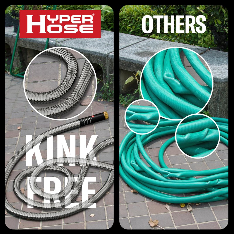 - UNBEATABLE DURABILITY: Crafted from premium 316 stainless steel—40% stronger than 304 steel—our Hyper hose is the ultimate garden hose, built to outlast traditional rubber hoses with unmatched strength and resilience with added 2% Molybdenum material and multi-layer flexible inner tube, its structure is stronger than traditional rubber water pipes or expandable / pocket hoses. Also, it can withstand dog bite, dragging through wall edges and ground, and will not break, crack or leak.