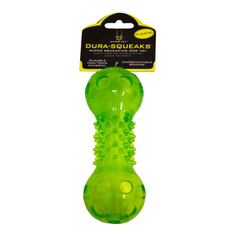 Hyper pet Dura-squeaks Barbell dog chew toy is the floatable, durable, unpredictable bouncing toy and sure to please any dog with a squeaker in each center.