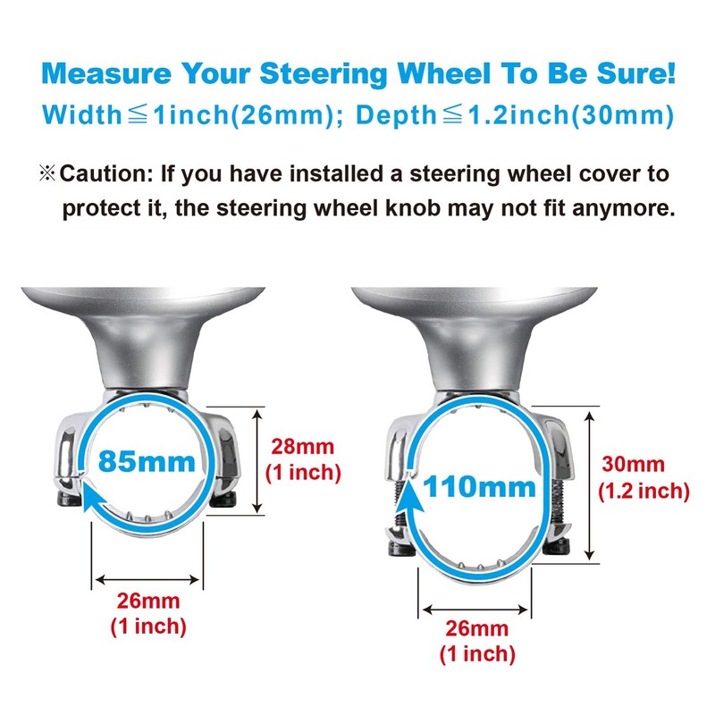 - ✅ Universal Knob: Car steering knobs for drivers and fits standard steering wheels with a width of 26 mm ( 1 inch) or less and a depth of 30 mm (1.2 inch) or less. The knob fits a car car / boat / tractor / mower. But if you have installed a steering wheel cover, the steering wheel knob may not fit anymore.