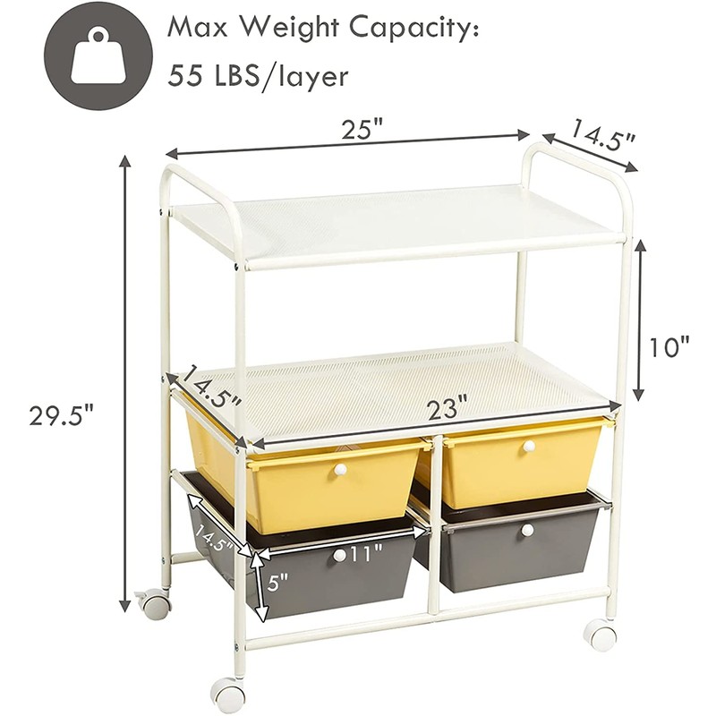 • 【Four Drawer And Two Layers】The cart has four drawers and two levels of platform and offer ample space to you to store and classify your stuff. 2 metal shelves to store bulkier items such as lighter small appliances, books and more. 4 drawers with front pulls, perfect to store smaller and loose items. It’s semi-transparent and protect your privacy.