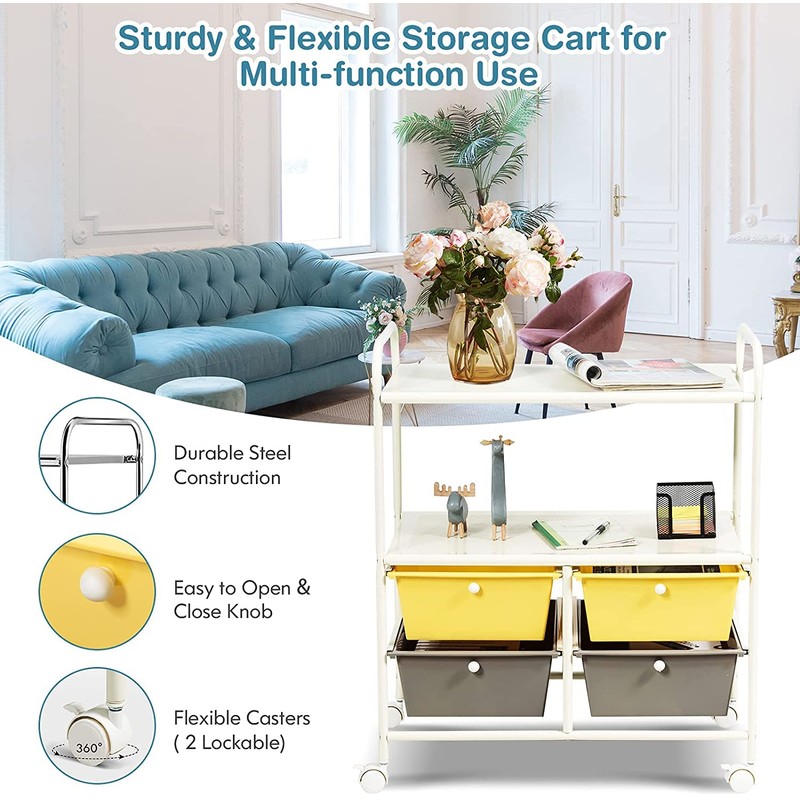 Hysache Rolling Storage Cart, Utility Organizer Cart w/ 4 Drawer 2 Shelves Trolley, Metal Frame, Plastic Storage Drawers on Wheels for School Office Home, Multifunction Organizer (Yellow)
