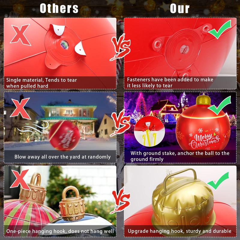 - Durable and reusable: the baubles for Christmas decorations are made of durable PVC, waterproof and weather resistant, not easy to tear, break and blow away. Our package includes the ground stake, you can use it to anchor the ball to the ground. Thicker fixings have been attached around the 3 holes around the place where the inflatable Christmas ball is attached to the ground spike.
