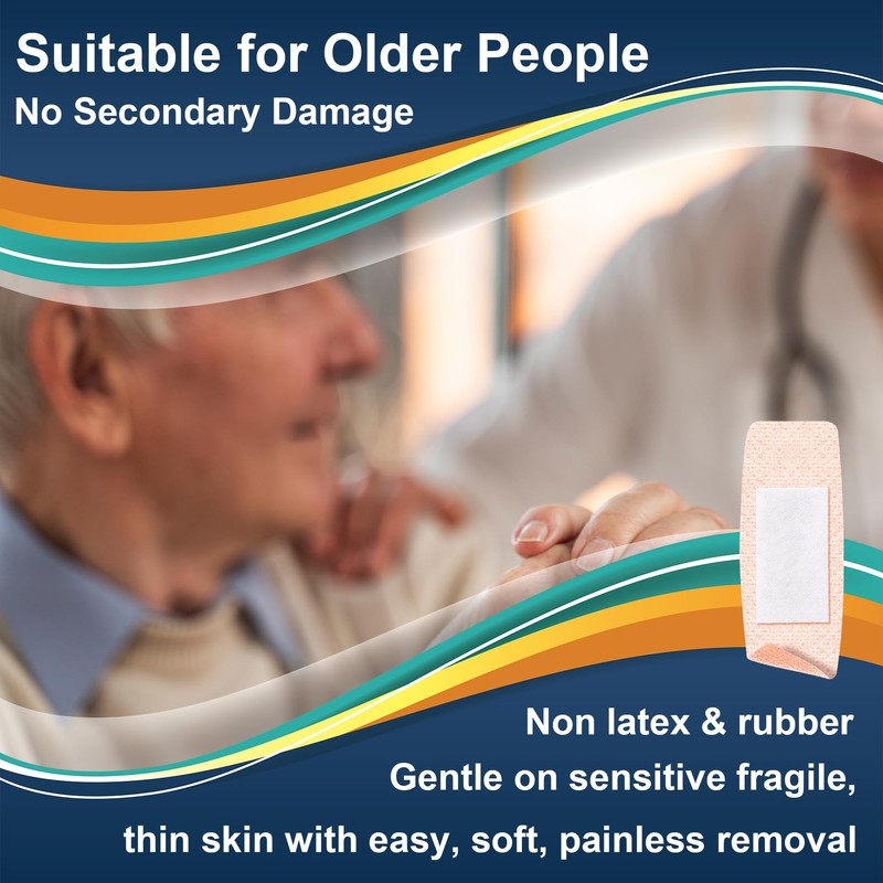 - Design for the Elders: As we aged, our skin has become fragile. Silicone bandages stick well to skin but not the wound and come off easily for daily changes. For adults, it has a large enough surface to cover the wound. Best of all, they do not hurt while removing. No discomfort or secondary damage, no latex
