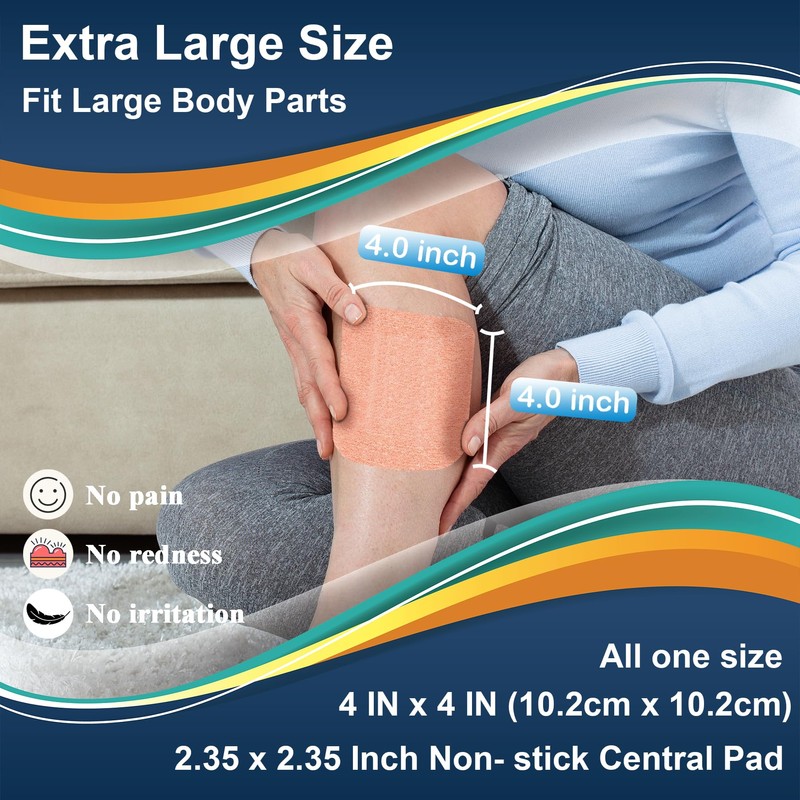 - Non-stick Central Pad: For adults, it has a large enough cotton pad to cover the wound. The absorbent cotton pad is 2.36 x 2.36 inch extra large. It's as wide as dressings which makes it suitable for larger wounds. The pad is surrounded by the silicone adhesive so it seals the wound completely