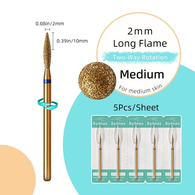 - hytoos 2mm Long Flame Cuticle Cleaner Nail Bits | Quantity: 5Pcs/set | Grit: Medium - M | Color: Titanium | Head 2*10mm(0.07*0.39in),3/32"(2.35mm) Shank Size, two-way rotation