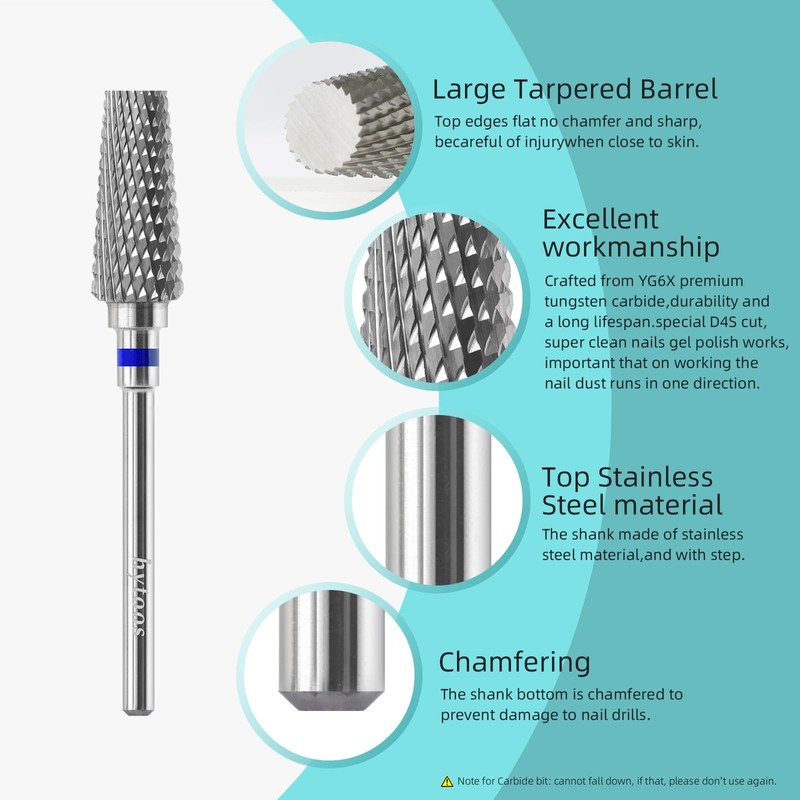 HYTOOS Large Tapered Barrel Nail Drill Bits, 15mm Flat Top Conical 3/32" Dust Proof Carbide Nail Bit, Professional Drill Bits for Nails, Electric Manicure Gel Polish Acrylic Clean Removal Tool, Medium