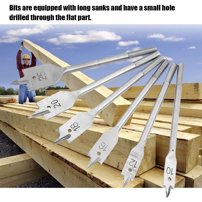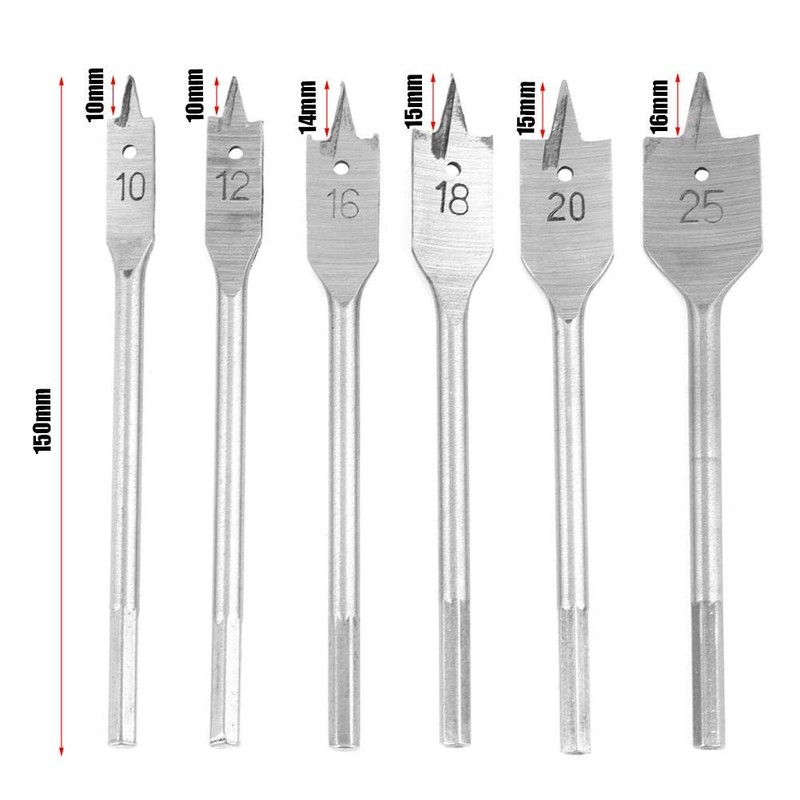 Hyuduo - Juego de 6 Brocas Planas Para Carpintería de 10 A 25 Mm de Acero de Alto Carbono, Planas, Para Carpintería, En Bolsasierra de agujero