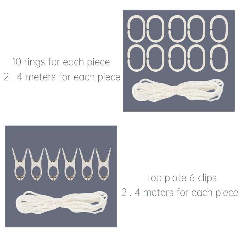 3.Pull hanging rings through holes of curtain cloths (have hole on the brim), the clip them to the two 2.4m rope.