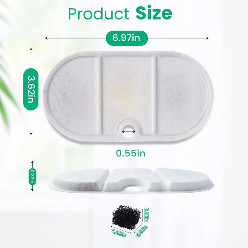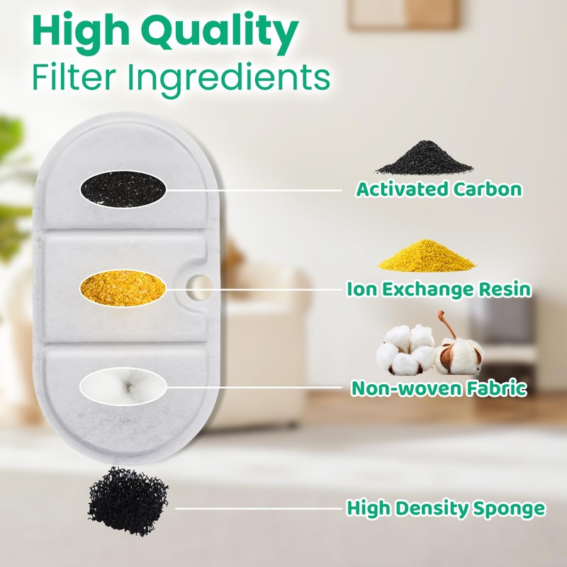 - Material - The pet fountain filter is composed of non-woven fabric, activated carbon, and an ion exchange resin. They can filter hair, heavy metals, and improve the taste of the water so that pets can drink clean and fresh water.